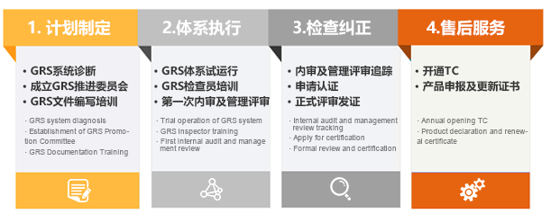 全球回收标准(GRS)是一项自愿产品标准,用于跟踪和验证最终产品中回收材料的含量。该标准适用于及GRS产品生产及贸易的整个供应链,包括加工、制造、包装、卷标,销售和使用的所有产品内含量至少20%的再生材料。且所有标准的产品都必须显示回收组分的百分比,回收材料的含量达到49%以上,才可以加贴GRS标识。